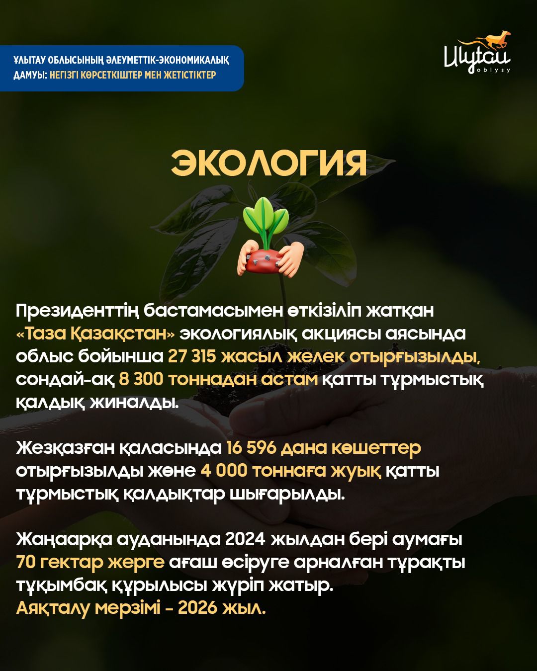 «Таза Қазақстан» акциясы аясында облыста 27 315 жасыл желек отырғызылды және 8 300 тоннадан астам қатты тұрмыстық қалдық жиналды. Жезқазған қаласында – 16 596 көшет және 4 000 тонна қалдық өңделді. Келесі жылы «ПетроҚазақстан Құмкөл Ресорсиз» 100-дей жасыл желек отырғызуды жоспарлап отыр.